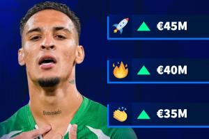 德转给出了安东尼身价变化的4个选项:3200万欧、3500万欧、4000万欧、4500万欧;目前安东尼的身价为3000万欧元,他也将确定迎来身价上涨。