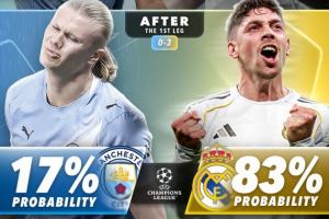 在首回合比赛前,曼城的晋级概率高达72%,皇马仅28%,而在首回合0-3失利后,曼城的晋级概率仅剩17%,皇马晋级概率则飙升至83%。