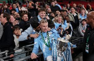 体育资讯3月24日讯 曼城2-0战胜阿森纳夺得联赛杯冠军,哈兰德赛后惨遭一男球迷强吻。